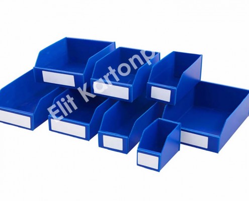 - Oluklu plastikten üretilen raf kutuları; darbelere, aşınmaya ve nemli ortamlara karşı yüksek direnç gösterir.